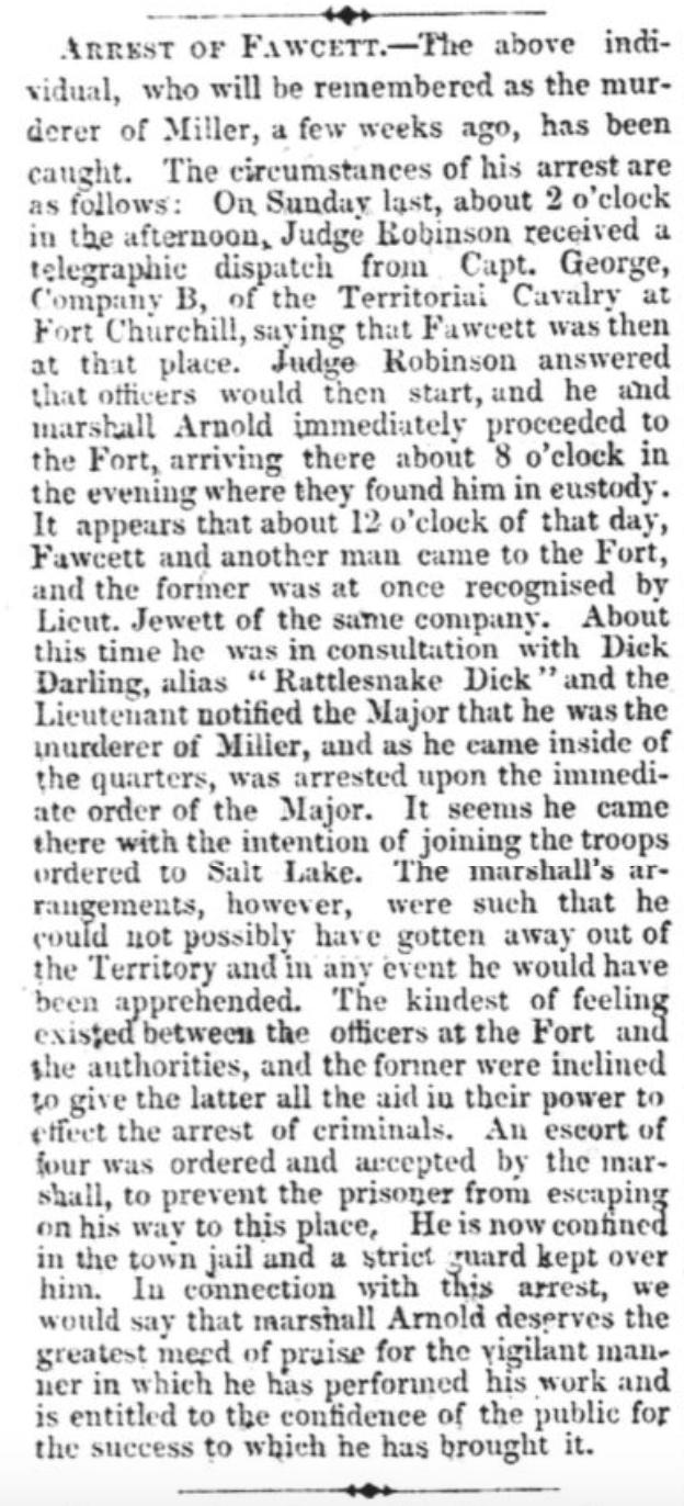 Yeah, it’s light, but he is associated with, uh, family members of it. So about a month after Rattlesnake Dick was shot by his wife. Um, I found a story in the Goldhill Daily News. October 13th, a man named Faucet was murdered by a man named Miller. So Miller and Rattlesnake Dick are friends. Or acquaintances, associates, I couldn’t quite find out. But they arrived together at Fort Churchill and a lieutenant there immediately recognized Miller. So he pulls Rattlesnake Dick aside and he just right away just told the lieutenant that, yeah, Miller was the murderer. For sure he did it. And so like this kind of sets up the idea that I think his nickname should be Rat Dick. ’cause he just rats everybody out at the first opportunity he gets.