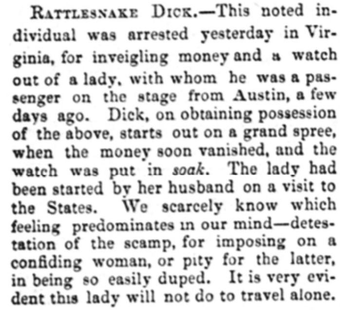 Well, he was arrested, but he couldn’t be charged with, um, anything more than I think, public drunkenness or anything. And I think they got him for stealing the watch, but you know, that’s not gonna land him a prison sentence, I don’t think. But only two weeks later, Rattlesnake dick, quote, from the Goldhill Daily News “continues onward in his career of rascalities.
