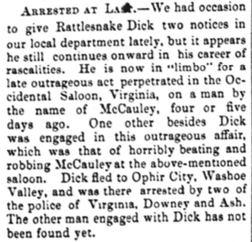 So. He goes to the Occidental Saloon in Virginia City and he perpetrates a horrific crime against a Patrick McCauley. Uh, one other person was with Dick: M.M. Woods, and what they did is they just beat and robbed McCauley at the saloon arguing over a card game. So after they take Macaulay’s money, they flee to Over City and the Virginia City police pursue him and they arrest him, and that is going to lead into his first long prison sentence.