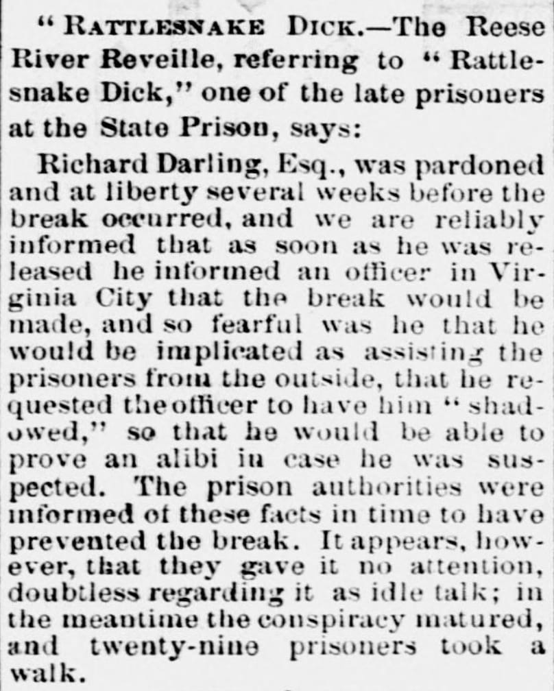 So 1871. Rattlesnake Dick is pardoned. About a month after he’s pardoned, Rat Dick is back. He knew of a plan that was taking place in the prison for a huge prison break so all the prisoners in there were going to, uh, escape and he knew of the plan and he wanted to make sure that he wasn’t implicated as trying to help from the outside. So, he goes to the police and he lets them know, please, uh, put a watch on me. I want you to know I’m not helping in any way. I don’t want to be implicated. They’re planning on breaking outta prison, and essentially the police just didn’t believe Dtick at all. So in the end, 29 prisoners end up escaping even though they were warned ahead of time, and it’s still to this day, the largest prison break in US history.