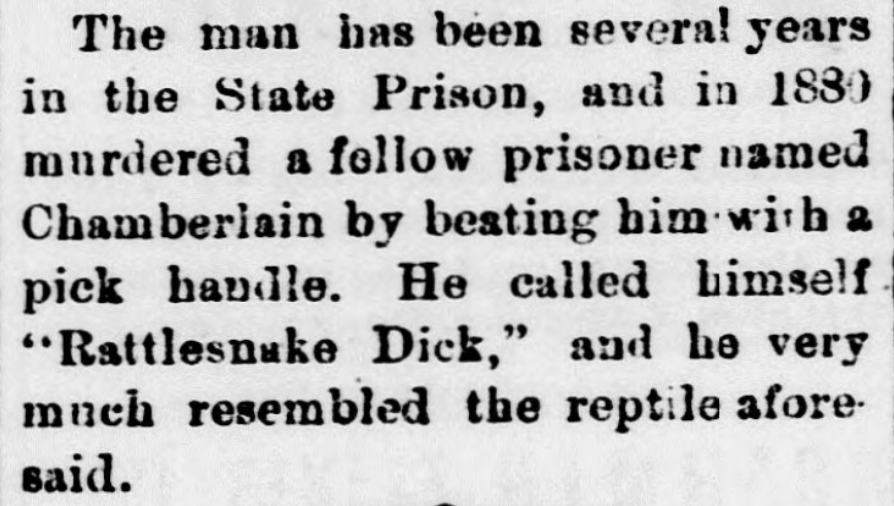 He hangs out in prison until 1870, excuse me, 1871. That’s when he gets pardoned and after serving about five years of his 14 year sentence. Backtracking just a little bit, one thing I wanted to note is that The only story I could find other than that while he’s in prison is that a lot of these people were in there for hard labor and just smashing stone all day. And he actually got really talented at doing engravings and carvings and a lot of the prisoners did. And so they were actually able to sell their art. And um, there was note that Rattlesnake dick made a beautifully carved and ornamented cribbage board.