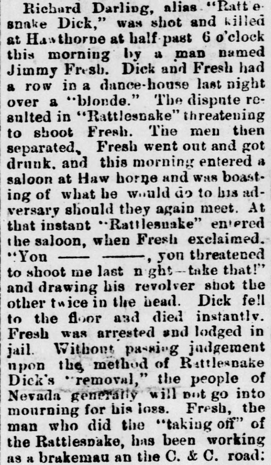 No, they’re all awful people. And we’ll close out Rattlesnake, Dick’s life on August 24th, 1883 when he’s murdered by James Warren, better known as Jimmy Fresh. This was in Hawthorne, Nevada. The murder took place around 6:30 in the morning. So the night prior, Dick and Jimmy Fresh had a bit of a disagreement in the dance house, fighting over a prostitute. Jimmy Fresh leaves and comes back way drunk. It’s 6:30 in the morning and Dick is still out at the bar at this point. When he sees Rattlesnake dick in there, he says, “you blank blank”. That’s what it says in the newspaper. “You blank blank. You threatened to shoot me last night. Take that!”, drawing his revolver and shot him twice in the head.