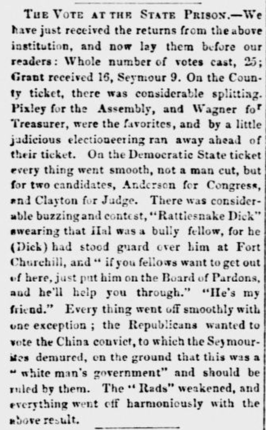 Yes. Yeah, 1864 was right in the middle of it, and Grant ends up winning, obviously, but he wins Nevada with 55% of the vote. What I found is the Carson Daily appeal reported on November 7th, 1868. They were reporting the votes cast from the prison. What I found is that there were 25 votes cast, grant received 16. Seymour received nine and Rattlesnake. Dick was asking his fellow inmates to vote for Anderson for Congress, and Clayton for judge. Couldn’t find much on these people except that they both lost. But Rattlesnake Dick swore that he and Clayton were very tight and Dick had stood guard over him at Fort Churchill and he was quoted as saying, “if you fellows want to get out of here, just put him on the board of Pardons and he’ll help you through. He’s my friend”.