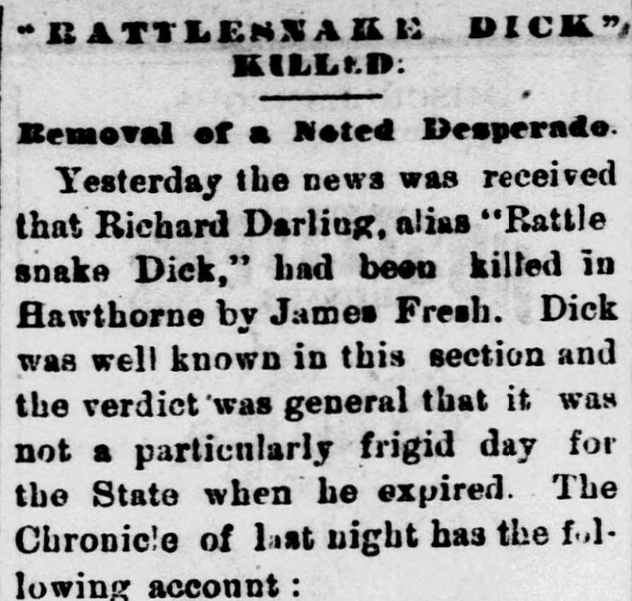 Yeah, and I mean, that’s something I wanted to touch on too, is the fact that like the newspapers, just the editorializing is great. They’ll just inject their opinion into these, uh, articles all the time. And we’ll talk about, oh, “he was just a scoundrel” and “we are quite familiar with Rattlesnake Dick” and, uh, you know, going so far as to like, just say when he finally dies, “he will not be missed”.