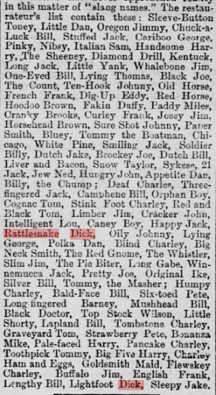Oh yeah. Let me pull those up. So yeah, I found this list in a newspaper of what they found to be enjoyable outlaw nicknames and Rattlesnake Dick is in this list, but there’s some other great ones. So right off the bat, one of my favorites. The first one, the name “Sleeve Button Tony”. Like Tony is known for having sleeves with buttons on it.